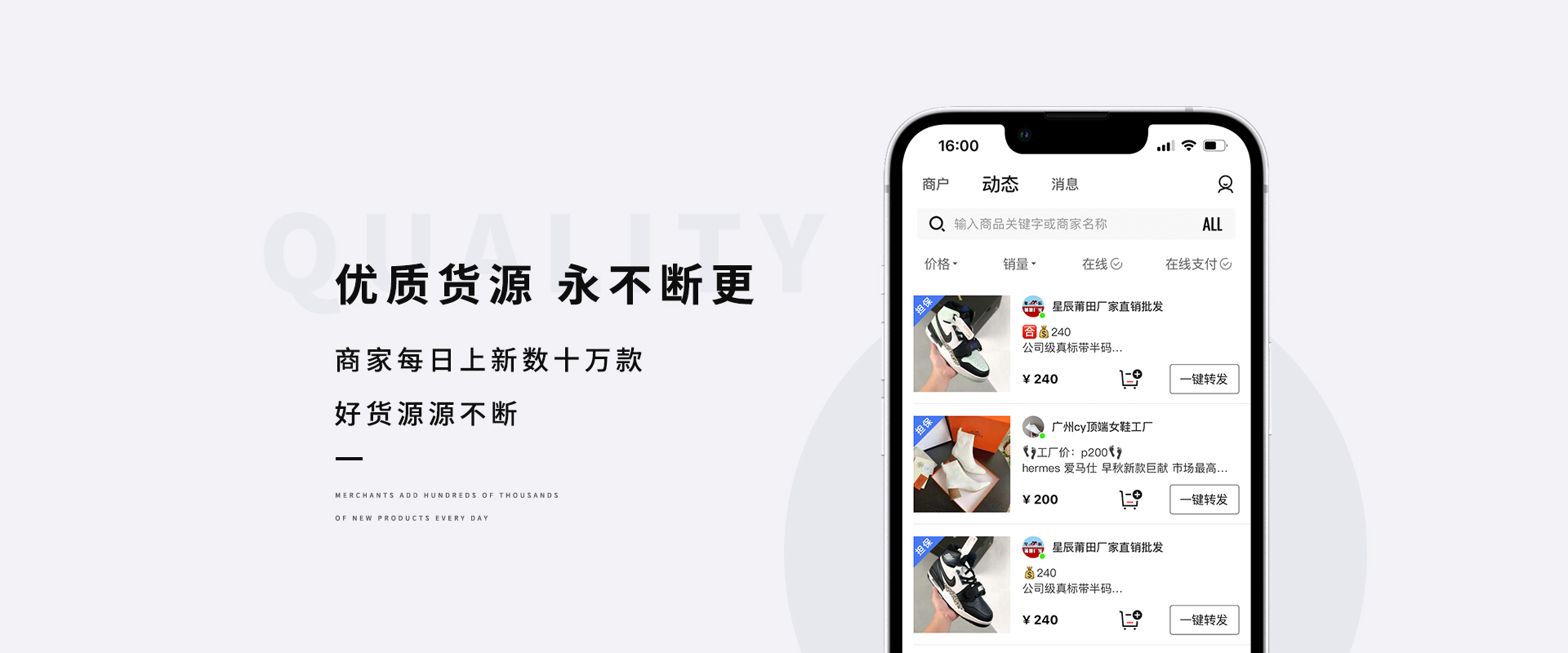精选全国批发市场,货源多,而且用户在广州海纳软件技术有限公司可以直面厂家进货,价格更优。每年拒绝10万炒货商家加入,没有中间商的一手货源平台。